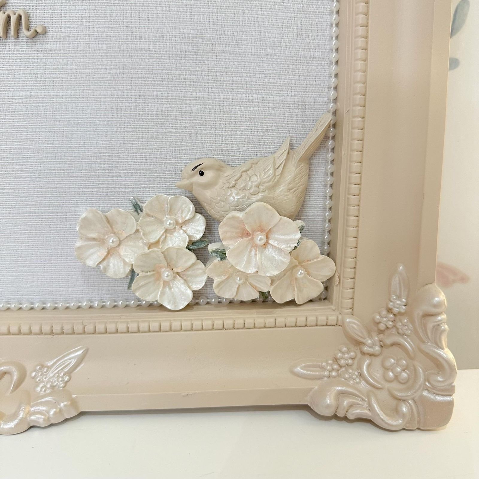 Fundo do quadro é revestido de tecido.